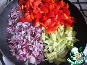 Обжарить 10 мин. в сотейнике или сковороде с толстым дном огурцы, лук-чеснок и перец.