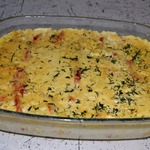 Вам придётся вынуть несколько кусочков поленты, т. к. их место займут дольки помидоров. Для этого я специально приготовил ещё одну форму для запекания, размером поменьше. -