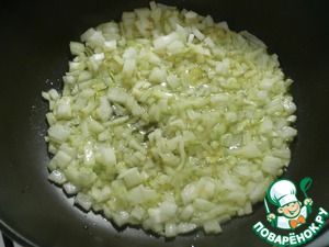 На сковороде разогреть пару ложек оливкового масла, обжарить лук до прозрачности,