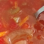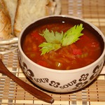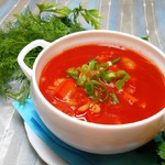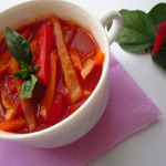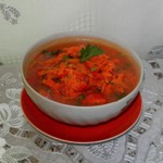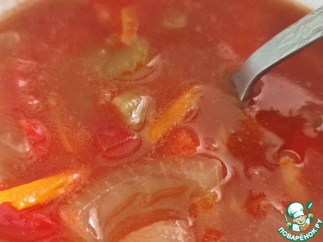 Сложить всю нарезку в кастрюлю, налить томатный сок. Варить 10 мин на сильном огне, 10 минут на медленном и дать настояться 10 минут. Томатный сок можно разбавить водой.
