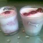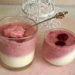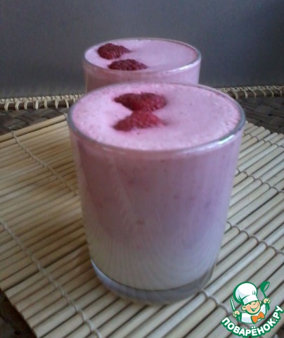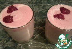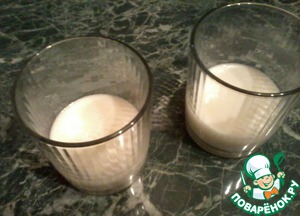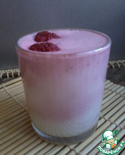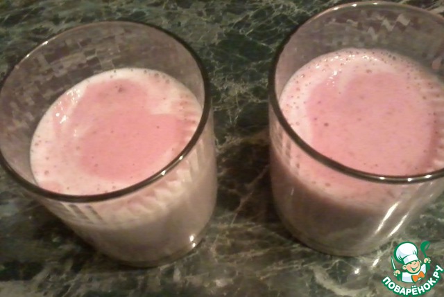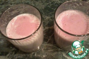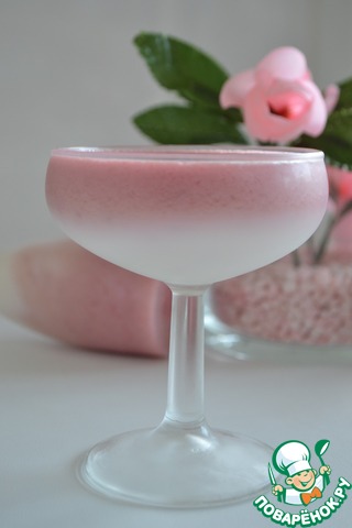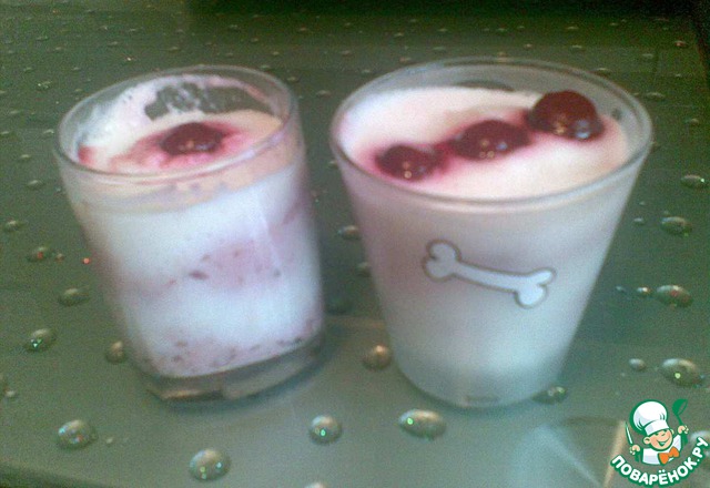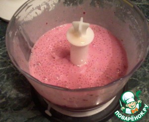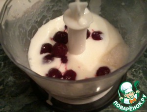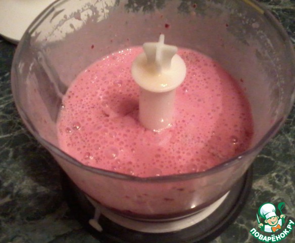 Для розового слоя: взбить в блендере (секунд 10) 200 мл кефира с вишней и 1 ч. л. сахара (или по своему вкусу).