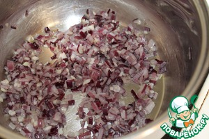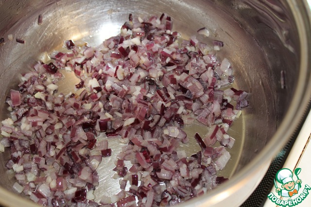 Обжарьте лук и чеснок в разогретом оливковом масле в кастрюле с толстым дном, 3 минуты.