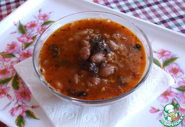 Положите фасоль и маслины в суп, перемешайте и варите 5 минут.