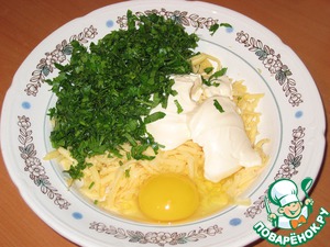 Сыр, майонез, яйца и порубленную зелень смешать и запечь на сковороде, как блин, с двух сторон.