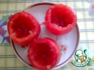 У помидоров отрезать верхушки, выскрести ложкой мякоть, посолить и минут на 20 оставить.