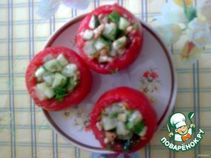 Первый раз решила сделать фаршированные помидоры. Что положить внутрь? Конечно, огурцы, они родные братья в салате. В холодильнике осталось немного ананасов, надо их реализовать. А может, и орешков грецких туда настругать? Полезно ведь. В результате таких рассуждений получилось вот такое украшение стола.