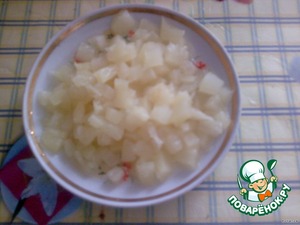 Поверх смеси нарисовать узорчик из майонеза (у меня он не очень хорошо получился) и положить маслинку (или оливку) для украшения.