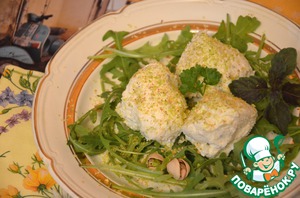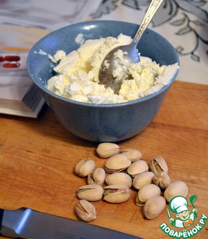 На тарелку выложить листья рукколы. С помощью ложки сформировать порции из сырной массы и выложить сверху на рукколу. Поставить в холодильник на 30 минут. Перед подачей сверху посыпать натертыми фисташками, украсить зеленью.