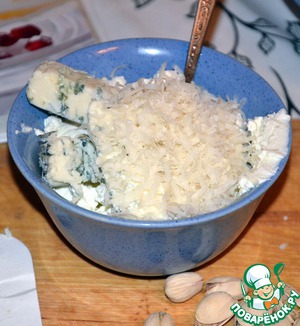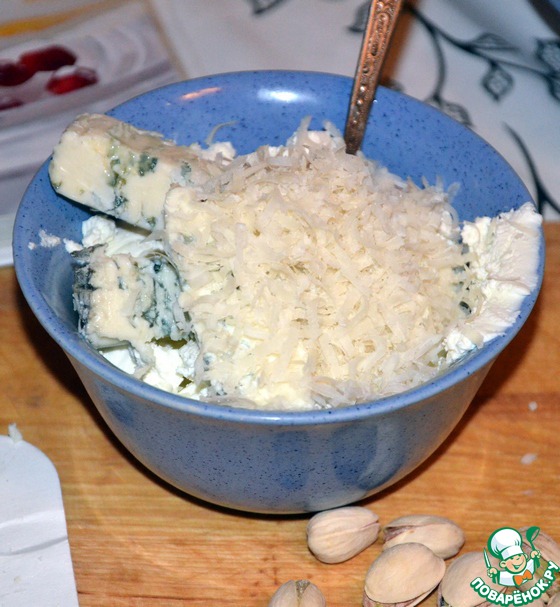 В емкость выложить рикотту, горгонзолу и тертый Грана Падано.