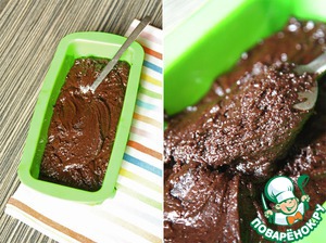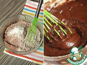 Добавим в смесь сахар, мед, масло и соль, перемешаем. Затем добавим смесь из муки, разрыхлителя и какао и замешаем тесто.