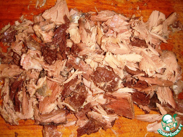 Тунец откроем, разберем на средние кусочки