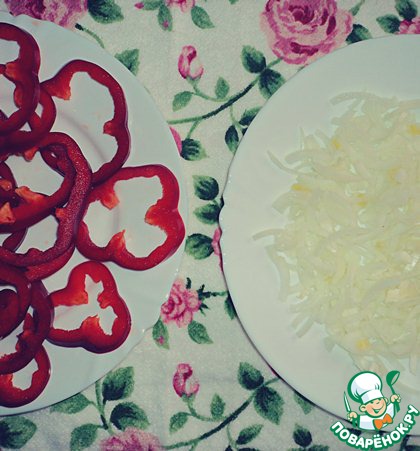 Режем болгарский перец кольцами (лучше выбрать разных цветов — это выглядит красочнее, у меня был только красный=)), предварительно удалив семена. Лук нарезать полукольцами, чеснок -через чеснокодавилку.