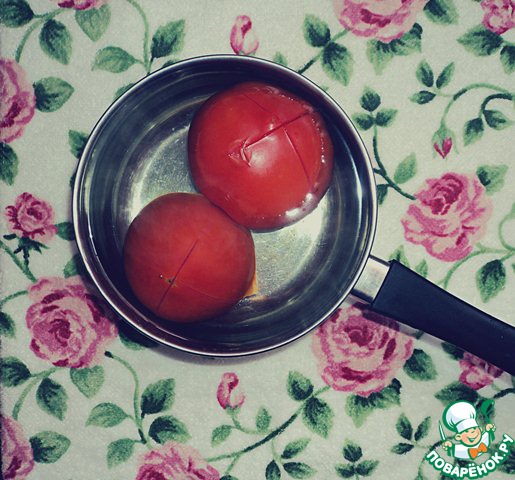 Помидоры ошпарьте, снимите кожицу, мякоть нарежьте кубиками.