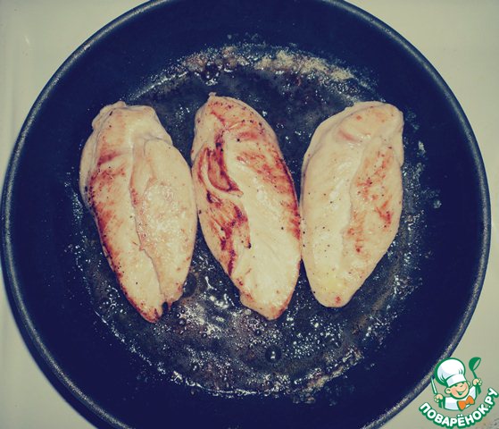 Куриные грудки посолить, поперчить, оставить мариноваться на 10 минут. (На заметку, лучше каждую грудку разрезать пополам и слегка отбить, так выходит гораздо сочнее)