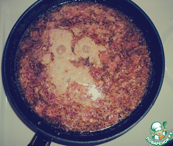 Готовим соус: Тертый чеснок поместить в сковороду, пассеровать 30 секунд, затем залить водой, добавив нарезанные помидоры, хорошо перемешать. Добавить итальянских трав, овощной бульонный кубик, соль, перец, щепотку мускатного ореха. Влить полстакана сливок, перемешать.