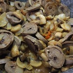 Обжариваем на растительном масле лук, добавляем к нему порезанные грибы и перец. Перемешиваем...