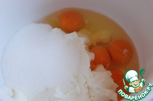 Смешиваем творог, 2 яйца, 200гр сахара, 200мл сливок, и пакетик сухого пудинга. Все хорошо взбиваем.