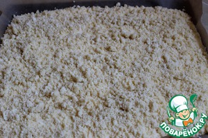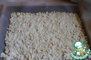 Сверху выкладываем нашу оставшуюся крошку. Можно еще сверху посыпать порезаным миндалем. Ставим выпекать при 200гр. 30 минут.