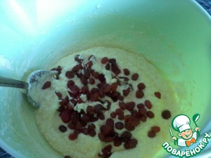 Затем добавить гашеную соду, щепотку соли - хорошо размешать. Добавить сушеную вишню и изюм.