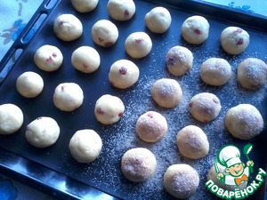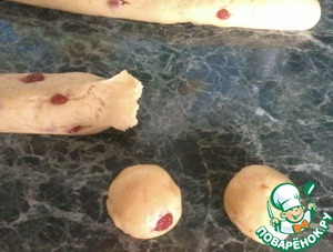 Тесто поделить на 2 части, скатать колбаской. Отрывать кусочки теста чуть больше грецкого ореха и подкатать их в шарик.