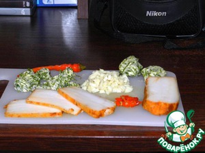 Теперь нарезаем сало, чеснок, перец чили и зелень (у меня зелень, замороженная в сливочном масле).