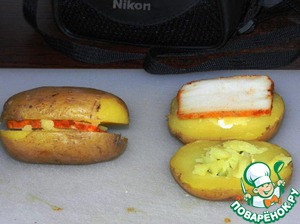 Теперь начинку в каждой половинке покрываем порезанной сердцевиной из углублений картофеля и на одну из половинок кладём пластинку сала. Так поступаем со всем нашим картофелем.
