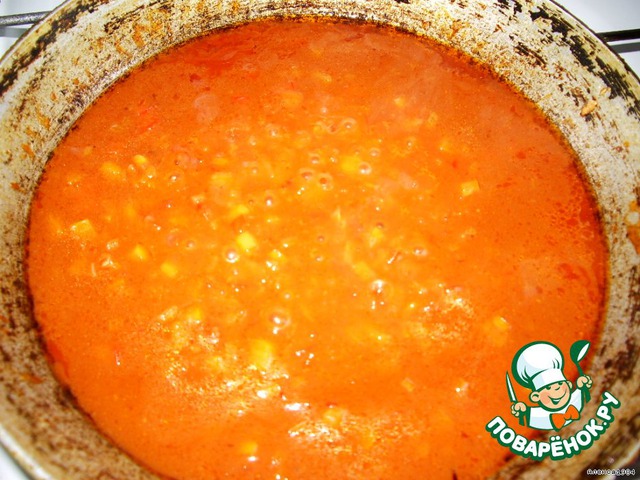 Добавляем к луку и перцу, чеснок (выдавливаем на чеснокодавке), я ещё добавляла вместо чеснока 1 кубик "крошка чеснок" от кнорр, добавляем 3 ст. ложки томатной пасты, добавляем немного воды или бульона, чтобы не очень жидко было. Тушим ещё минут 5.