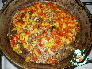 Режем болгарский перец и добавляем к луку, продолжаем обжаривать.