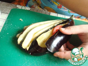 Когда мы убедились в том, что ножи наточены, а припасы готовы - начинаем делать веер! Для этого мы должны острым ножом несколько раз прорезать баклажан по направлению от плодоножки.