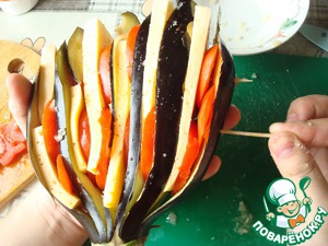 Лучше пользоваться длинными шпажками. Они хорошо скрепляют наш баклажан, а это залог того, что он не развалится в духовке. -