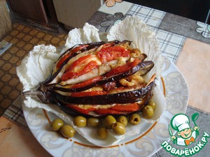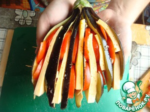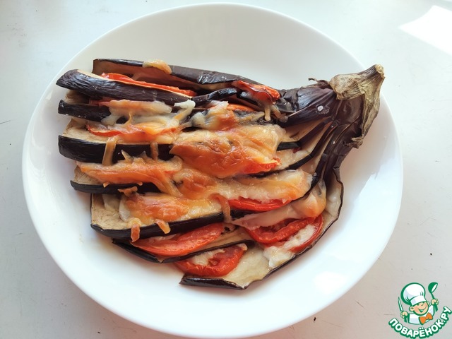 Это замечательное блюдо подойдет всем любителям вкусно покушать, не исключая вегетарианцев! Баклажановый веер ярок, аппетитен и ооочень ароматен! Отличное сочетание вкусов и веселые цвета - залог хорошего настроения! Вам понравится!