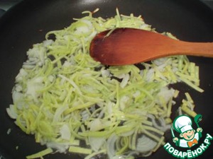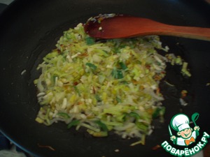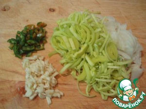 Лук, лук-порей (включая небольшую зеленую часть) нарезать полукольцами, чеснок мелко порубить, перчик чили очистить от семян и тоже мелко нарезать полукольцами.