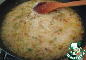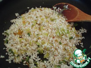 и добавить в сковороду к луку. Все хорошо перемешать до тех пор, пока рис не станет рассыпчатым. На это потребуется где-то минут 5.