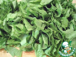 шпинат очистить от стебельков, хорошо промыть и нарезать на небольшие слайсы. Если шпинат мелкий, то можно его не резать.