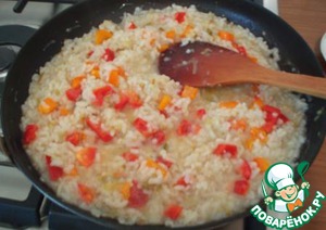 Как только рис второй раз впитал жидкость, к нему необходимо добавить болгарский перец. Все опять очень хорошо перемешать и дать потомиться под крышкой 3 минуты,