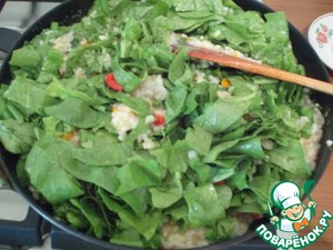затем добавить шпинат, все очень хорошо перемешать, накрыть крышкой и тоже дать потомиться 3 минуты, затем потушить огонь