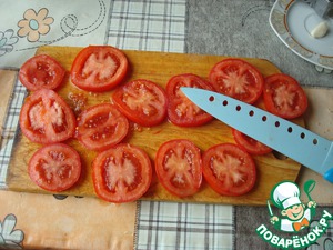 Затем нарежьте помидоры кружочками, толщина которых будет зависеть от уровня голода ваших гостей.