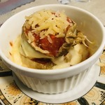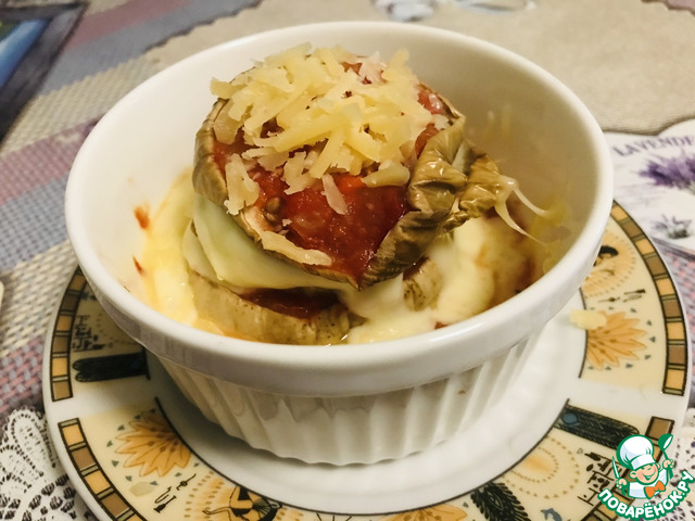 И так чередуйте слои (у меня по 5 кружков баклажана на каждую порцию). Затем опять баклажан, соус, моцарелла, пармезан.. Вот как нам баклажанчик даже улыбается)))
