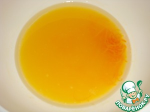 Взбить апельсиновый сок с сахаром, ванилином, цедрой и растительным маслом до полного растворения сахара. Вместо апельсинового можно взять лимонный сок, тогда бисквит будет светленький.