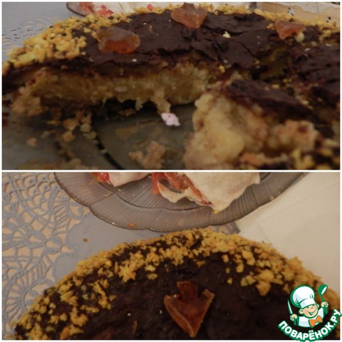 [+5]В крем я добавила вместо миндальной обжаренную пшеничную муку. Сверху шоколадная глазурь, и красота!
