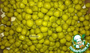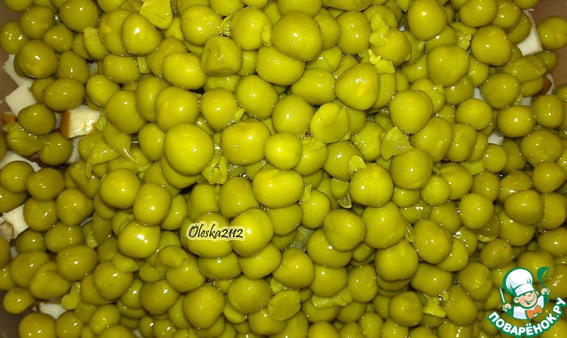 Зелёный горошек откинуть на дуршлаг, дать стечь рассолу. Добавить к другим порезанным ингредиентам.