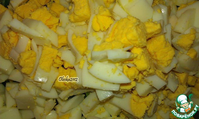 Яйцо также мелко порезать. Добавить к остальным ингредиентам, заправить майонезом (лучше домашним) и перемешать.