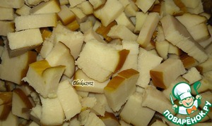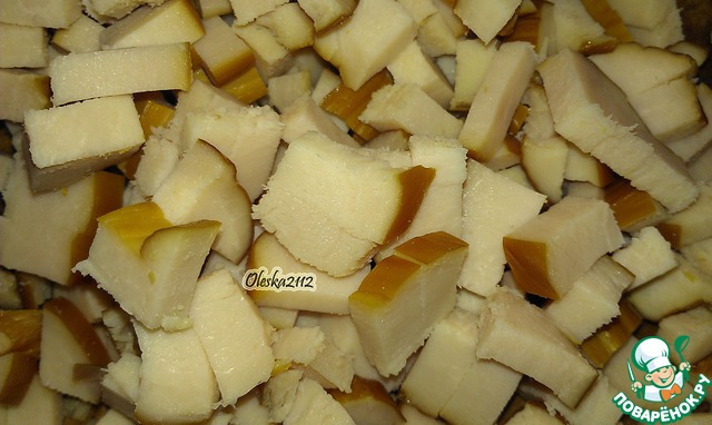Отварную или варёно-копчёную курицу порезать небольшими кубиками.