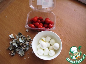 Отварить перепелиные яйца в течение 3 минут от закипания. Вымыть помидоры. Сухари замочить в небольшом количестве воды. На фото стакан 250 мл. Дать им набухнуть.