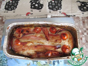 Сверху выложить бекон. Для детей и диетиков этот шаг пропускаем. В этом случае верх смазать маслом. Украсить оставшимися помидорками.