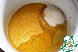 Смешать сахар, растительное масло и 3\4 апельсиновой массы.