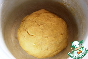 Добавить муку, смешанную с разрыхлителем теста. Замесить мягкое тесто.