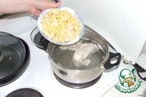 В трехлитровую кастрюлю положить мясо (я делала с курицей), залить водой и поставить на плиту -