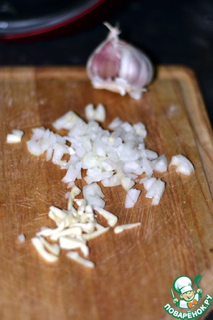Лук и чеснок очистить и нарезать мелкими кубиками. Обжарить в масле до мягкости. -
