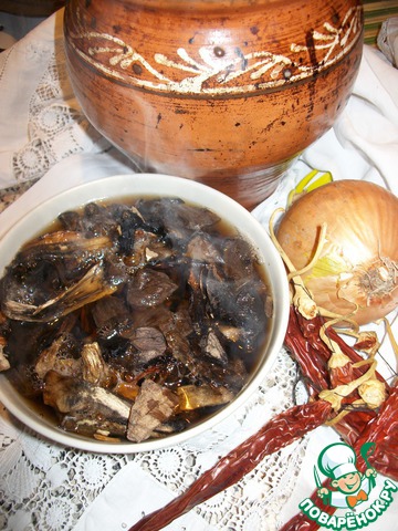 Картошечку - на 4 части (мы ее потом давить будем), в кастрюльку (я решила максимально приблизить рецепт к оригиналу и нашла горшок вместо кастрюли) перекладываем обжаренную смесь со сковороды, заливаем все это грибной водичкой, туда же отправляем картошечку (если воды не хватит - доливаем простой) и варим на медленном огне (или в духовке томим) до готовности картошечки. Это важно - если картошку не доварить, то потом, смешавшись с кислым капустным соком, она уже не сварится никогда. Потом туда капусту, уже поваренную, и опять в духовку или на плиту минут на 40. Вынули, картошечку прямо в горшочке толкушкой подавили - все, часа через 3 (настояться должно) - все. А если не пост - со сметанкой, на мясном бульоне, хотя и так вкусно. А мужикам после праздника - первое средство от головной боли.